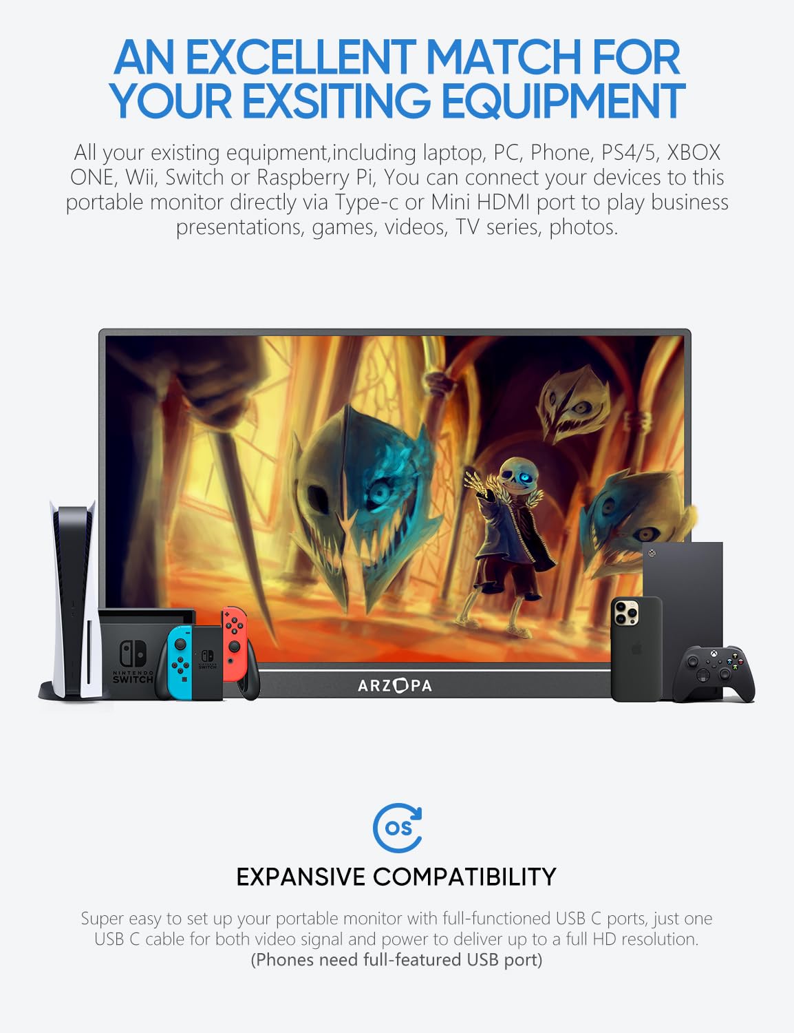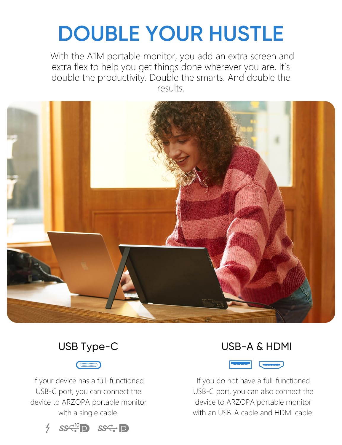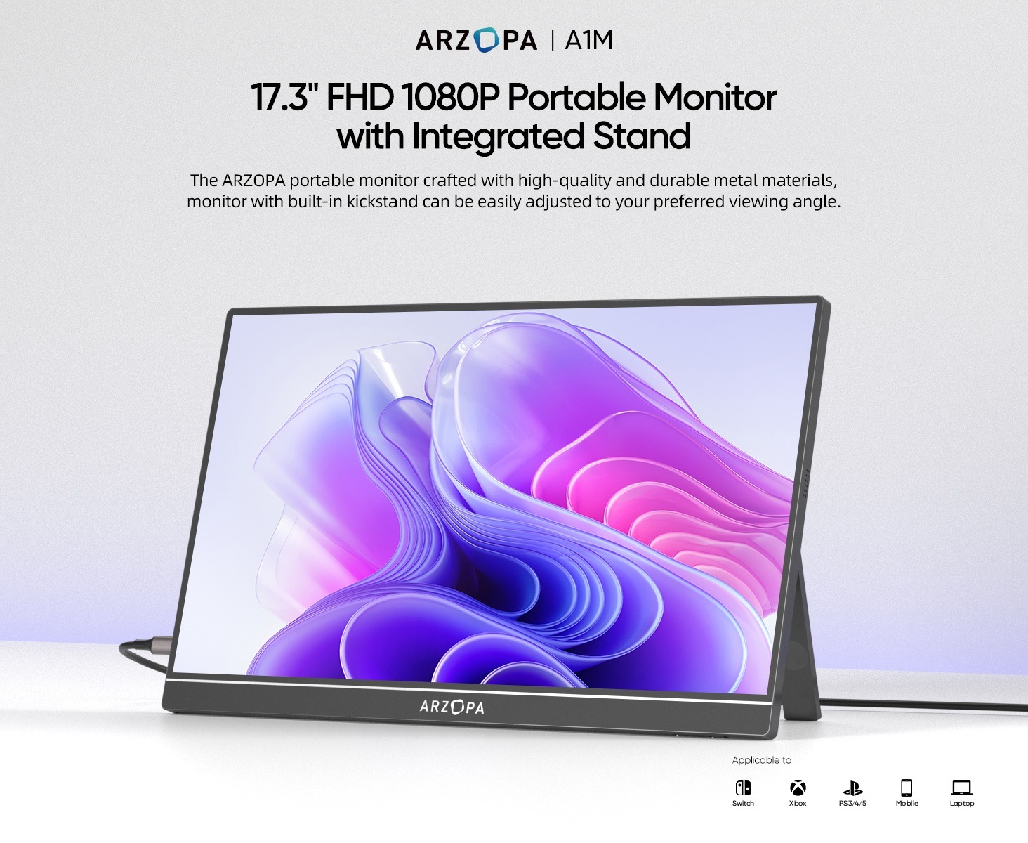 1 x ARZOPA 17.3″ 103% sRGB Portable Monitor, 1 x Mini HDMI to HDMI Cable (Data transfer only), 1 x USB-C to USB-C Cable (Full-functioned), 1 x User Guide |