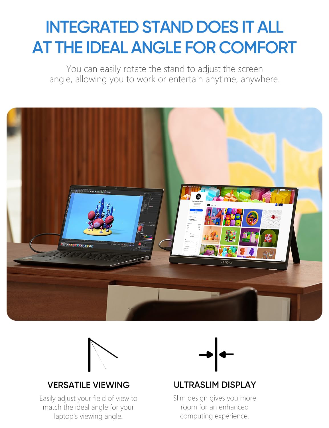 Extend your screen at the office, at home or on the go with this convenient, compact display. Conveniently set up your monitor to the left, right or behind your laptop. The dual USB-C ports on each side allow for versatility and better portability.