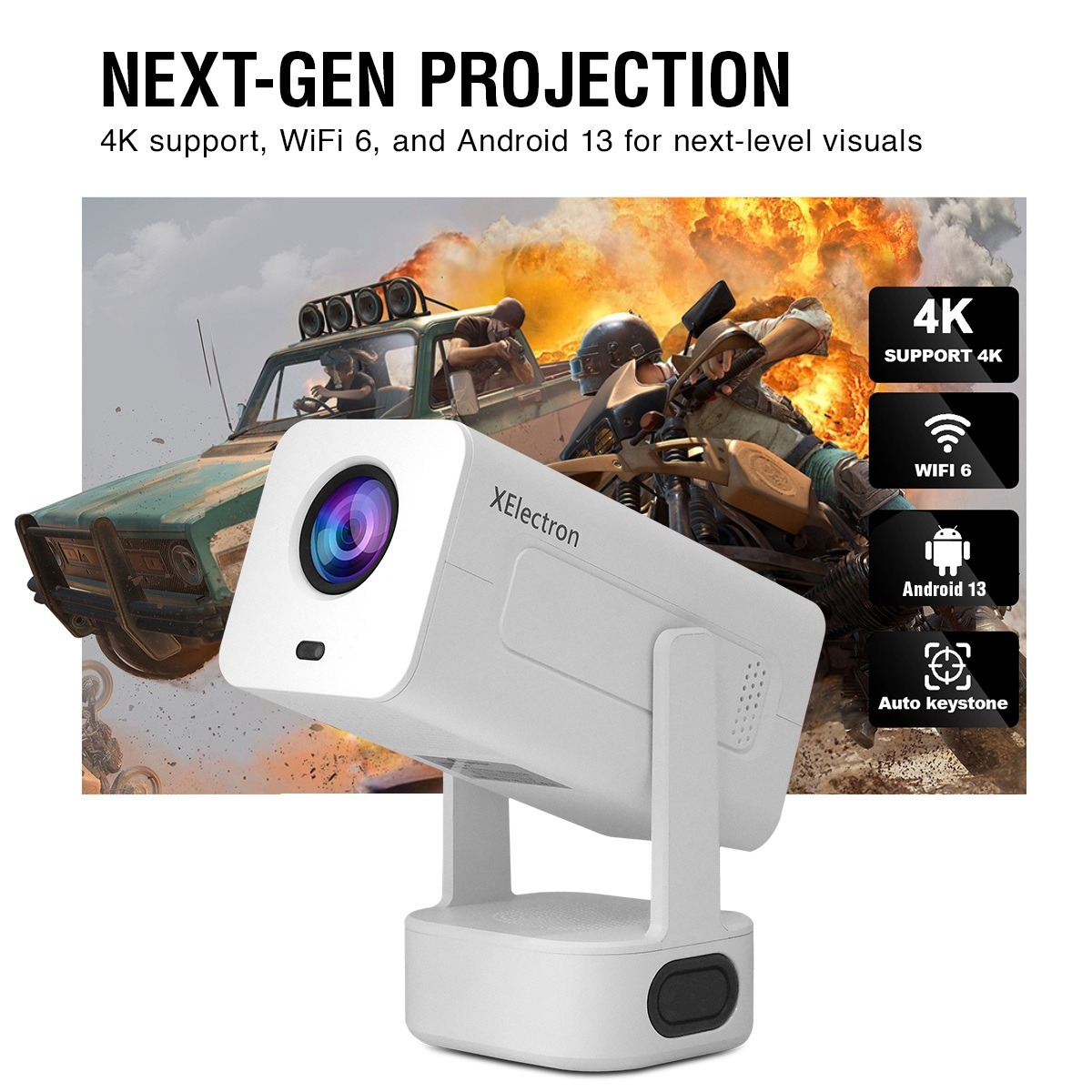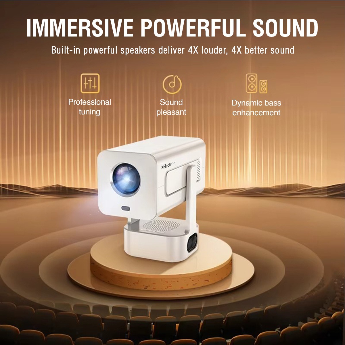 Transform any room into a cinema with XElectron’s high-performance projector. Featuring 200” max screen, 4X louder, Auto & 4D keystone correction, and 210° rotatable design, it delivers unmatched flexibility. With BT 5.0, WiFi 6, and built-in 20W speakers, enjoy a seamless, powerful experience.